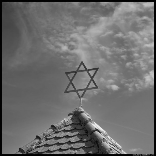 Der vergoldete Davidstern auf dem Dach des „Priesterhäuschens“ zieht die Blicke auf sich. Von hier aus konnten die Kohanim (Männer priesterlicher Abstammung) von außerhalb der Mauer die Gräber der Angehörigen sehen – ohne, gemäß der rituellen Vorgabe, den Friedhof zu betreten. Ihre Grabmäler zieren segnende Hände – das Signet des Netzwerks Jüdischer Friedhof Rödelsee.